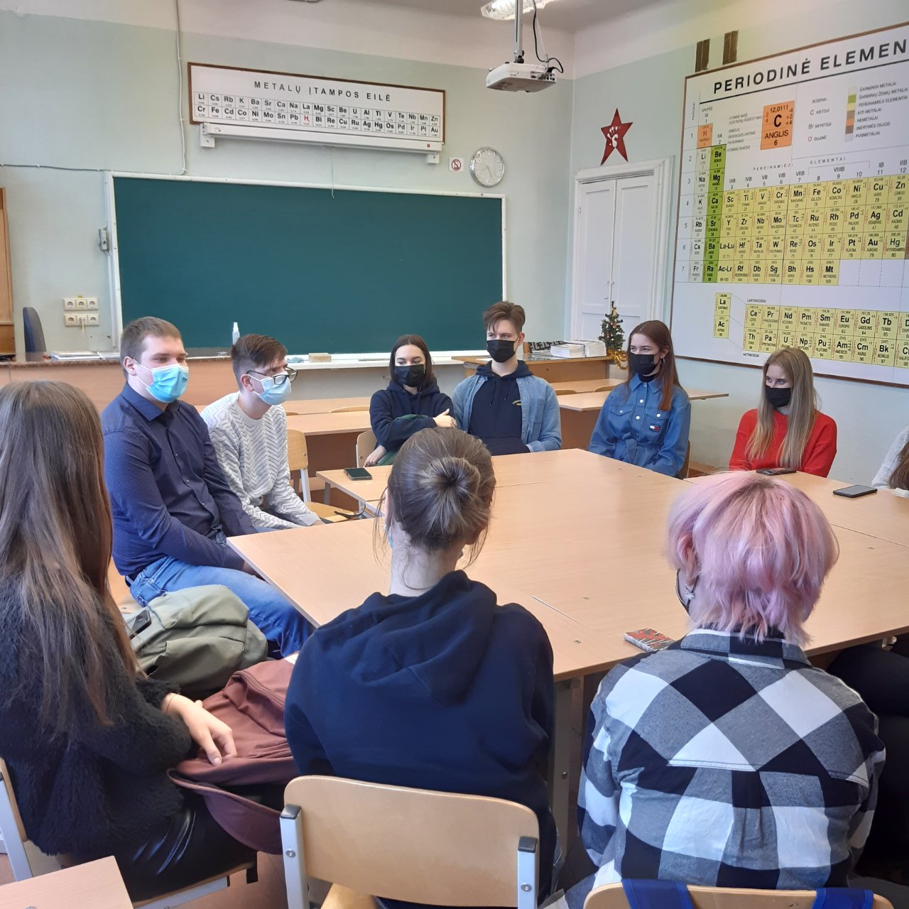 Medicina ir chemija – dvi populiarios specialybės, apie kurias galvoja mokiniai, pasirinkę mokytis chemiją A lygiu. Kuo studijos universitete skiriasi nuo pamokų mokykloje, kaip ruoštis ateičiai, ką studentai veikia laisvalaikiu?.. Atsakymų į šiuos ir kitus klausimus gimnazistai ir tikėjosi sulaukti iš buvusių mūsų gimnazijos mokinių Mariaus Dzvinkos, jau trečiakursio, studijuojančio VU chemiją, ir pirmakursio Kornelijaus Armono, pasukusio į medicinos mokslus LSMU. Džiugino nuoširdus bendravimas.