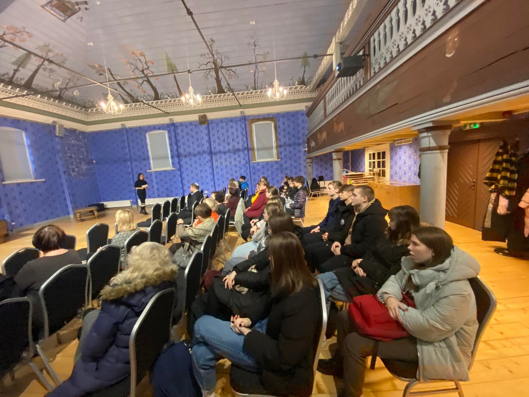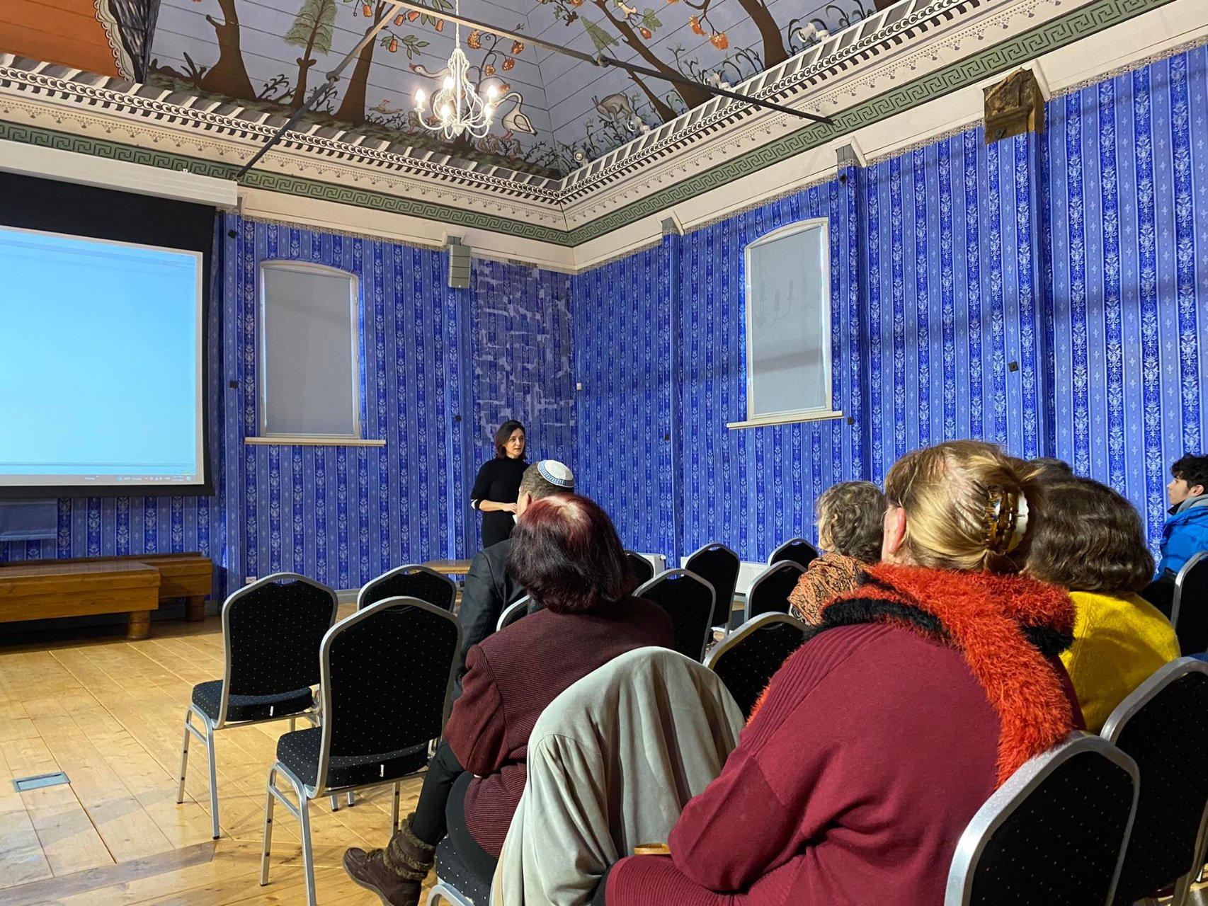 Po filmų peržiūros vykome į Šiaulių apskrities žydų bendruomenės namus. Mus pasitiko jos vadovas Sania Kerbelis, kuris papasakojo apie Šiaulių apskrities žydų bendruomenės veiklas, supažindino su žydų istorija, Holokausto laikotarpį. Taip pat aprodė mažytę sinagogą, įsikūrusią viename iš bendruomenės namo kambarių. Mus netgi pavaišino macais – tradiciniais žydų paplotėliais, kurie pakeisdavo duoną.