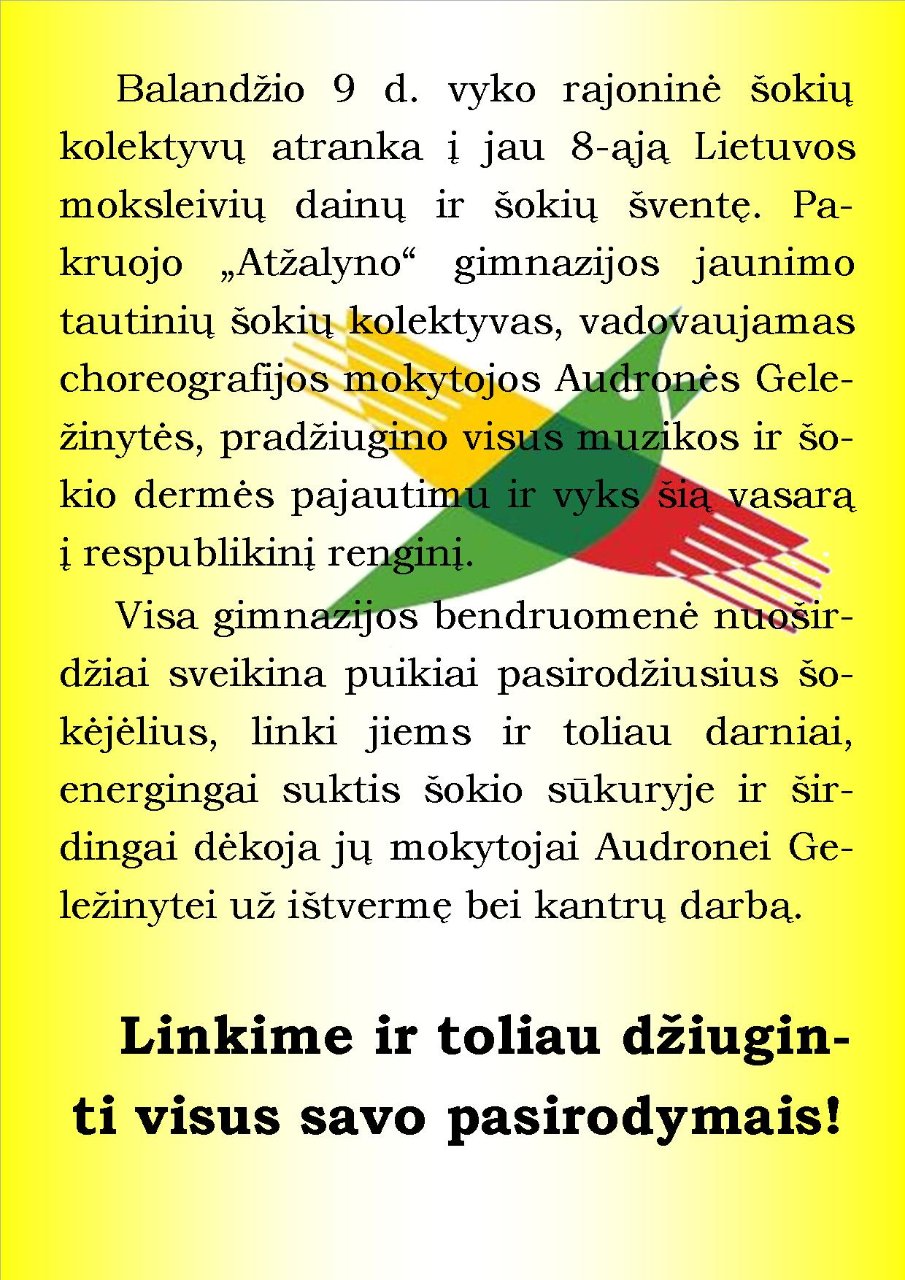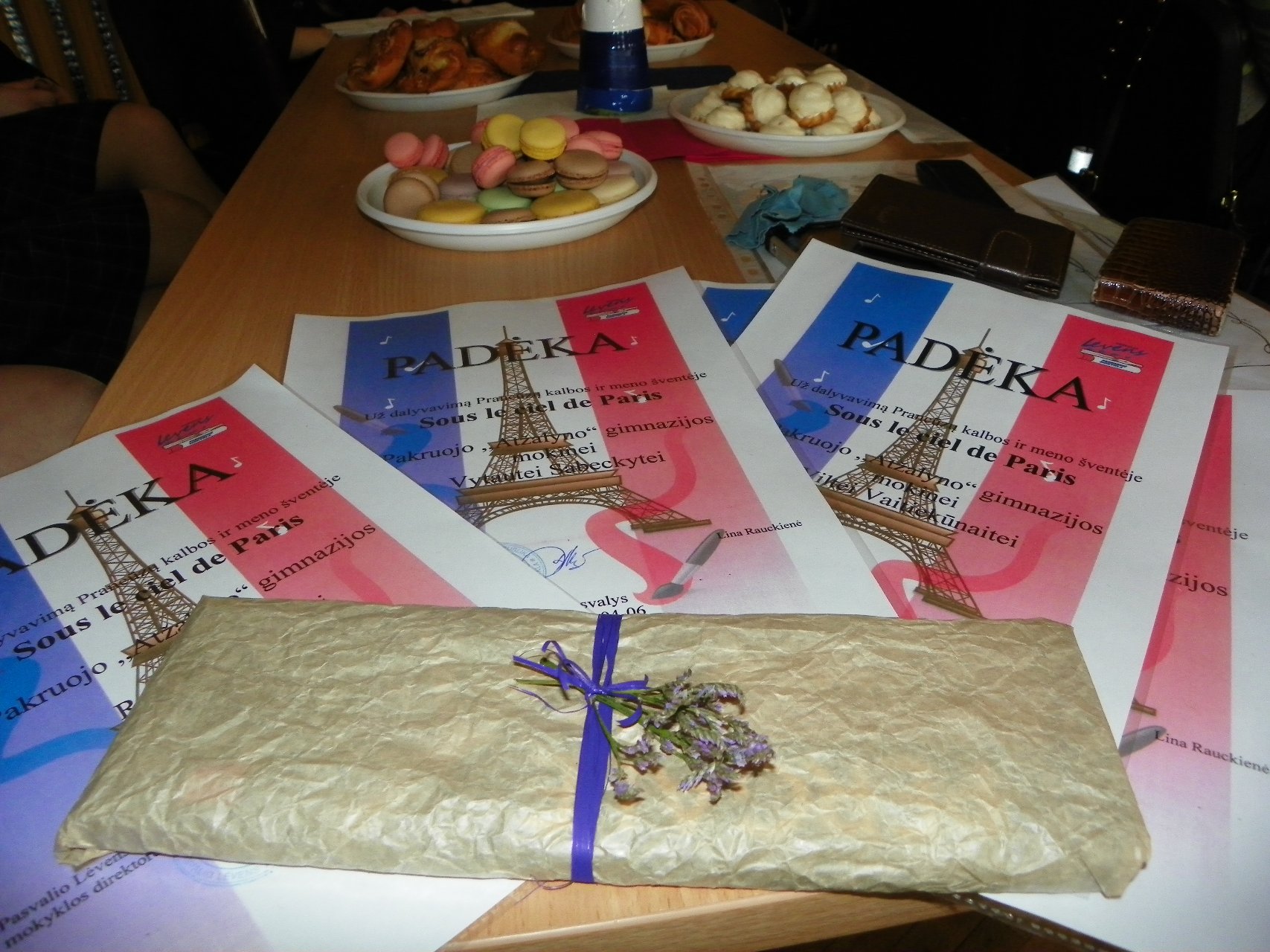 Balandžio 6 dieną buvome pakviesti į Pasvalio Lėvens pagrindinę mokyklą, kurioje vyko labai graži ir spalvinga prancūzų kalbos ir meno šventė „Sous le ciel de Paris“ („Po Paryžiaus dangum“). Į šią frankofonų šventę atvyko Pasvalio, Pakruojo, Anykščių ir Vilniaus bendrojo ugdymo progimnazijų, pagrindinių, vidurinių mokyklų bei gimnazijų mokiniai. Labiausiai džiugino mokyklų pasirodymų įvairovė (buvo galima dainuoti, šokti, groti, vaidinti), vaišinomės prancūziškais skanėstais, o šventę vainikavo nuotaikingas naujausių madų kolekcijos pristatymas! Visi šventės dalyviai buvo apdovanoti padėkos raštais ir mielomis dovanėlėmis. Dėkojame Pasvalio Lėvens pagrindinės mokyklos bendruomenei už puikią šventę ir šiltą priėmimą. Nuoširdžiai ačiū mūsų gimnazijos administracijai už suteiktą galimybę dalyvauti prancūzų kalbos mylėtojų šventėse Šeduvoje ir Pasvalyje.