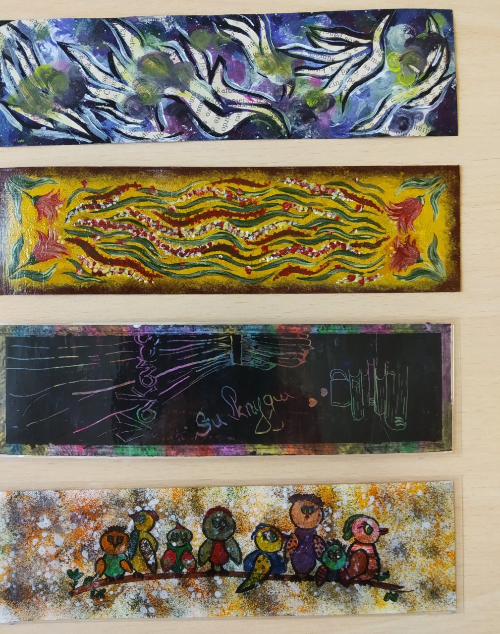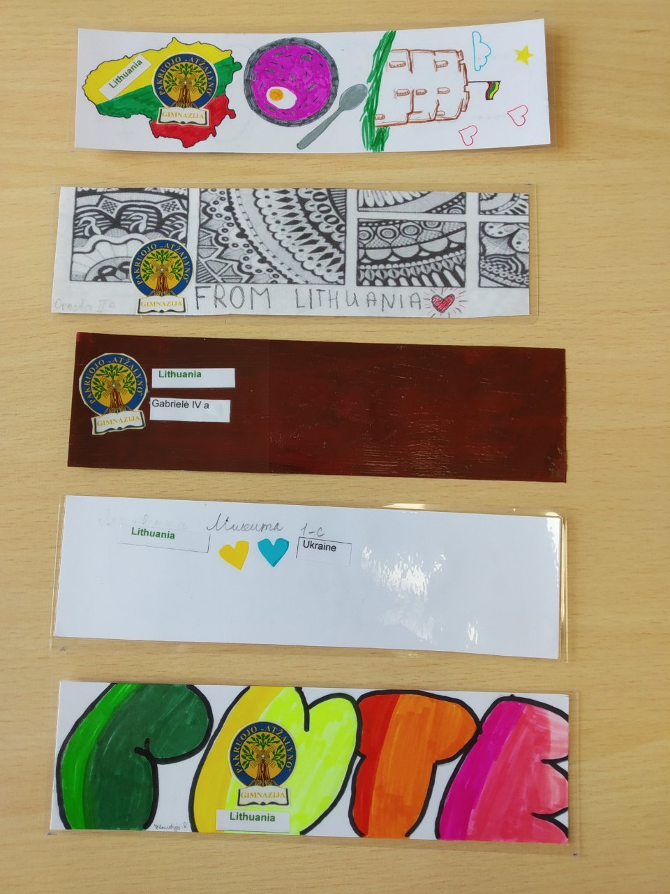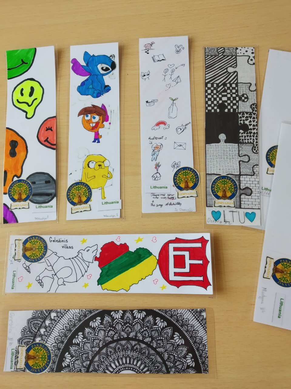 Knygų skirtukai jau paruošti ir ateinančią savaitę bus išsiųsti. Nuoširdžiai dėkojame mokiniams, sutikusiems dalyvauti projekte ir dalelę savo laiko skyrusiems kūrybai. Beje, šiemet ant kiekvieno skirtuko puikuojasi gimnazijos emblema – tokiu būdu mokiniai pristato „Atžalyno“ gimnaziją Indijos mokiniams.