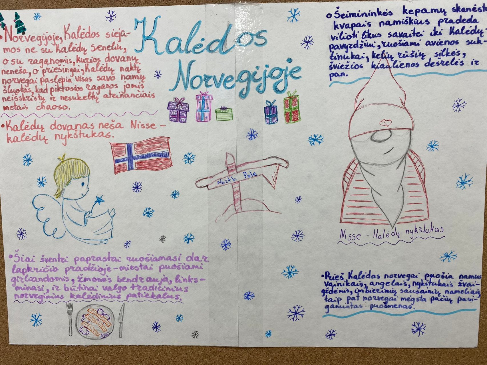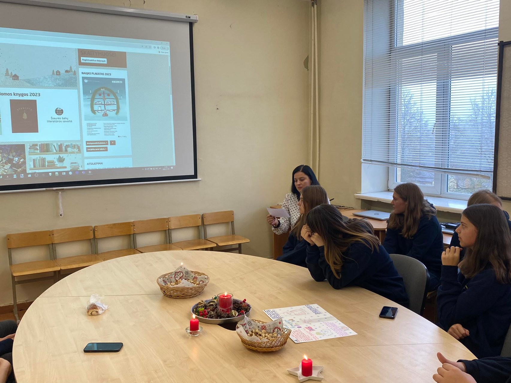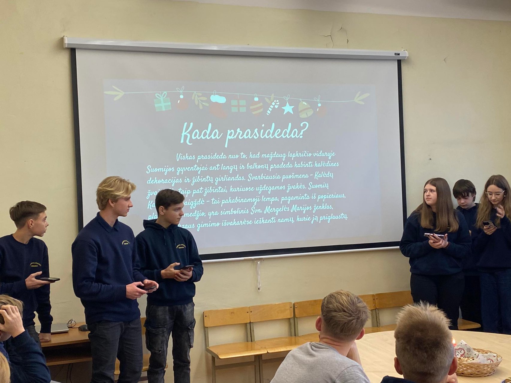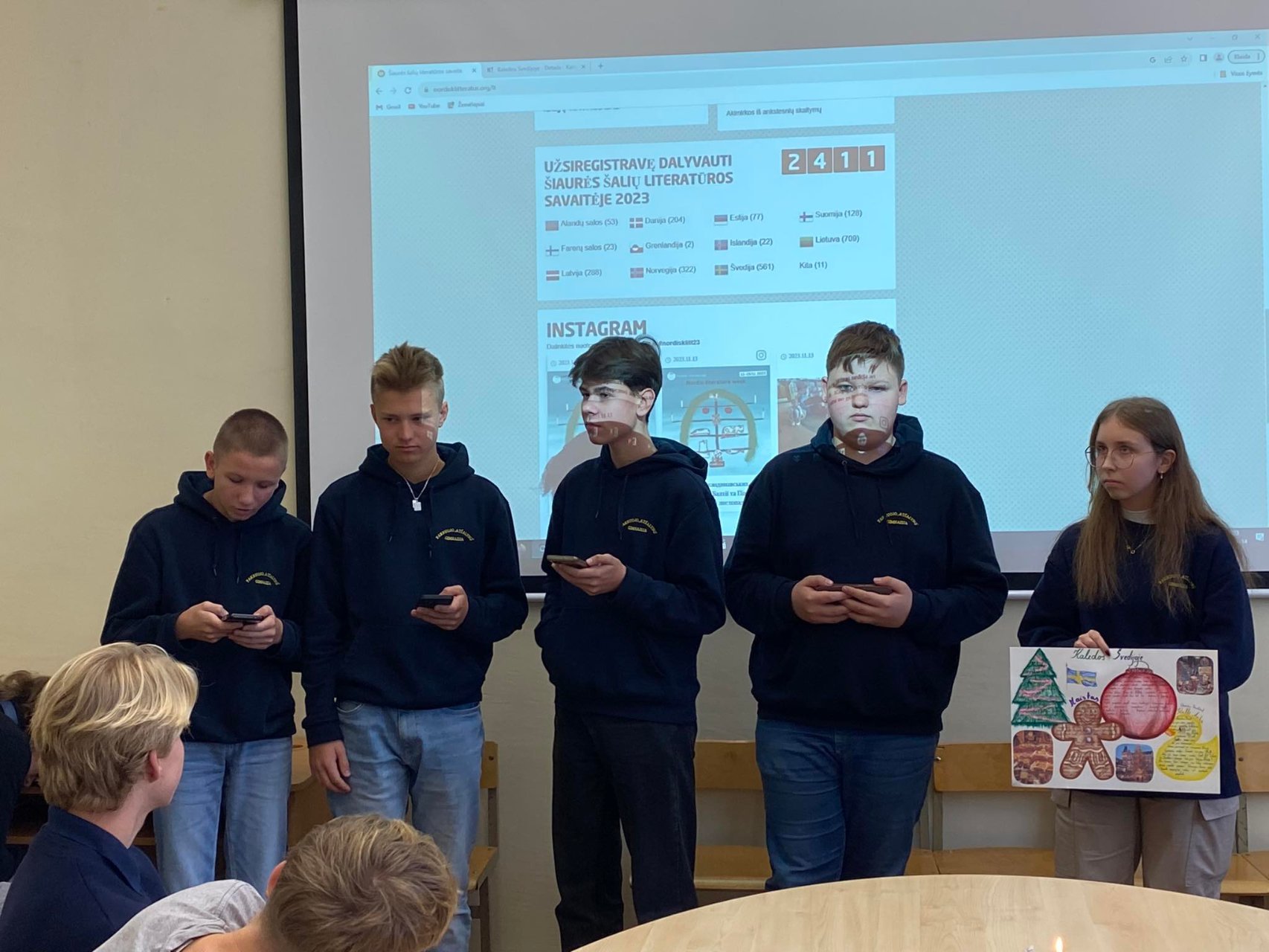Bibliotekininkė trumpai pristatė šių metų Šiaurės šalių literatūros savaitės temą, dalyvius, aktualumą, interneto puslapį. Po to mokiniai papasakojo, kaip švenčiamos šv. Kalėdos Suomijoje, Švedijoje, Norvegijoje ir Danijoje. Komandos paruošė labai skirtingus ir įdomius pristatymus: viena komanda rodė pateiktis, kita pakvietė dalyvauti viktorinoje „Kahoot“ platformoje, kitos sukūrė informatyvius plakatus. Klausydami gimnazistų mintyse jau ragavome kalėdinių pyragų, sužinojome, kad dovanas neša ir nykštukai, išgirdome daug naujų dalykų apie taip laukiamos šventės prasmę, tradicijas, papročius, iš naujo atradome jos grožį, o gal net pasiryžome aplankyti kokią nors šalį. Be to, dar skaitėme šiemet siūlomą tekstą – Ingvild H. Rishøi knygos „Stargeitas. Kalėdų pasaka“ ištrauką. O pabaigoje neiškentėme. ir paragavome kūčiukų – tegu taip prasideda advento laukimas, o paskui ateina šv. Kalėdos Lietuvoje...