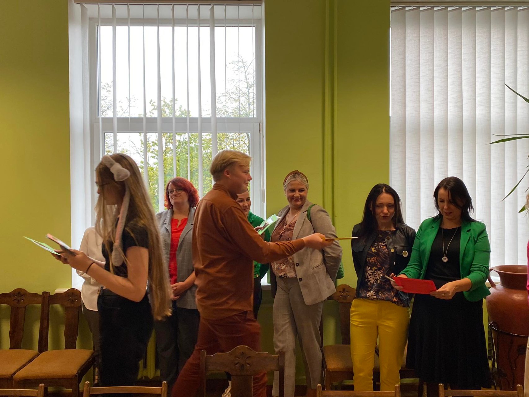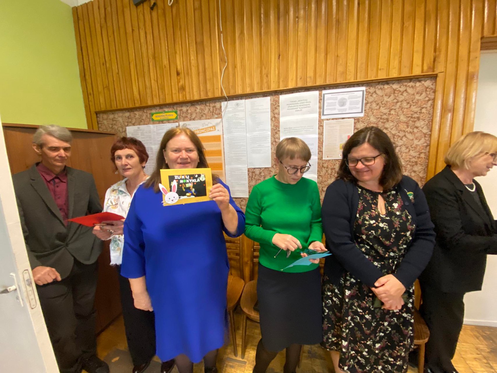 Po trijų pamokų mūsų mylimi pedagogai buvo kviečiami į mokytojų kambarį - jų laukė vaišės ir „zuikiai“, kurie įteikė nuotraukas.