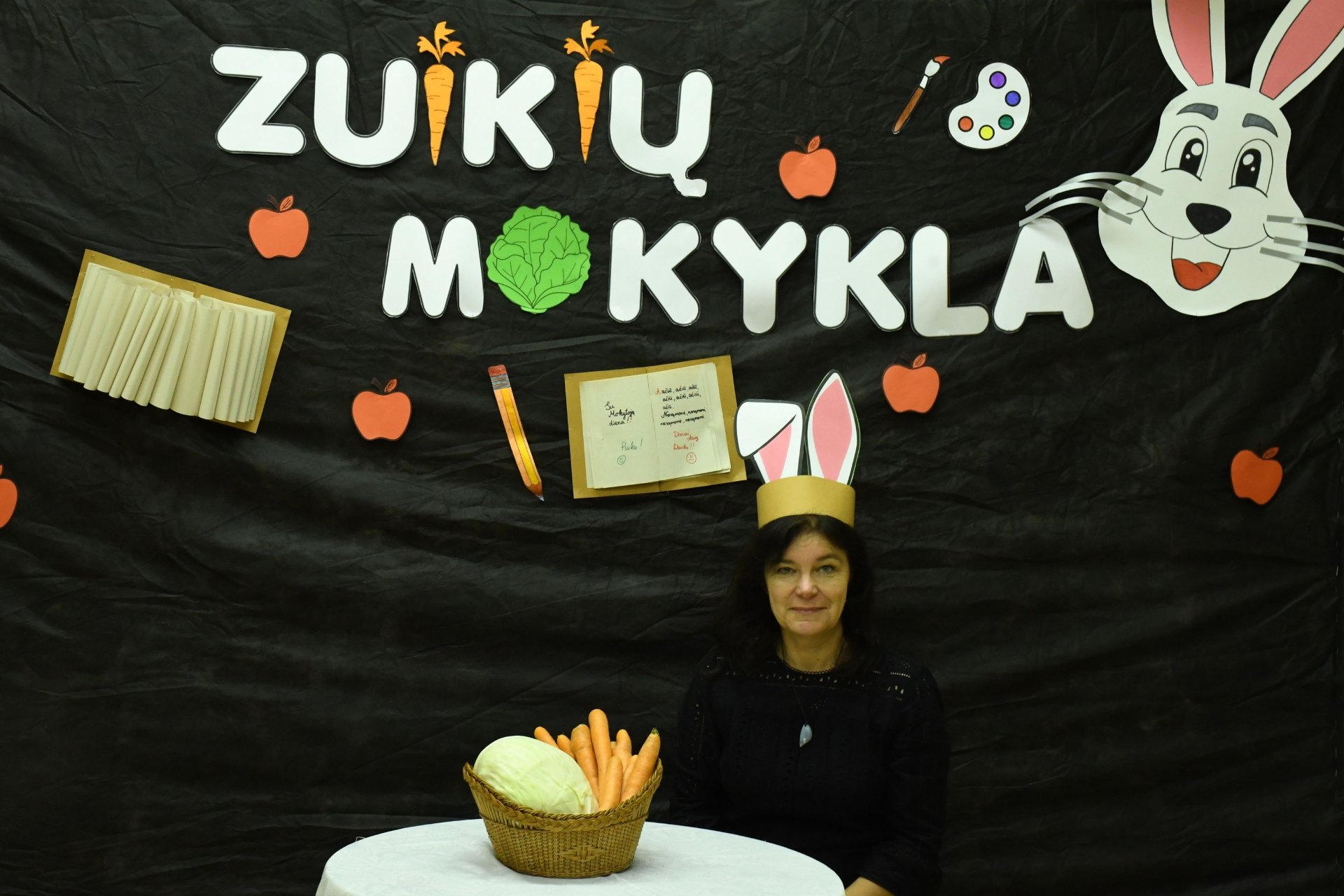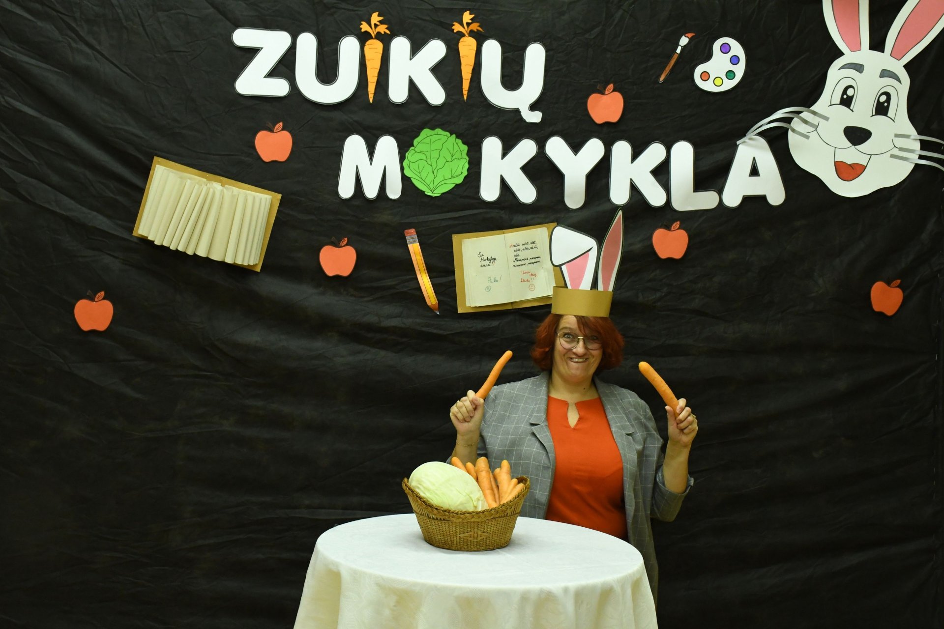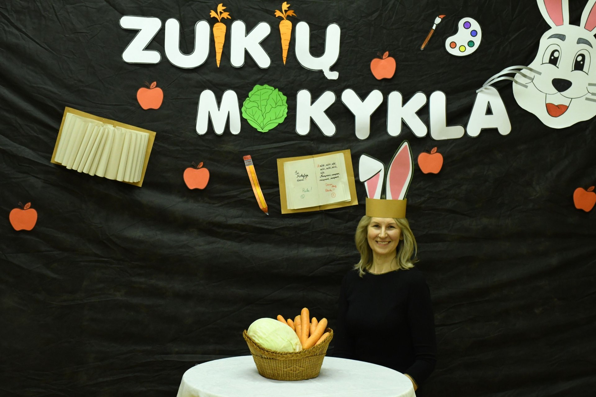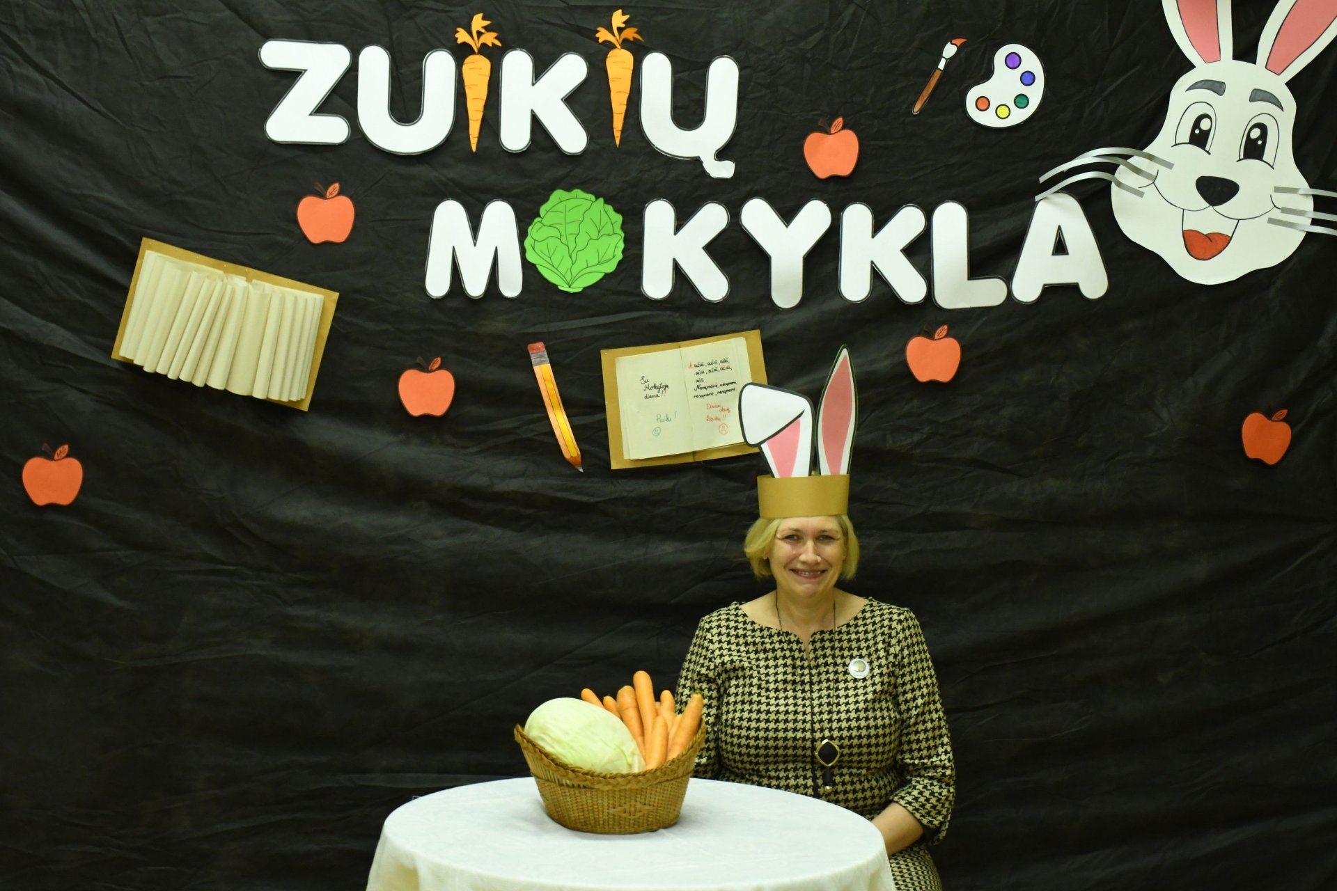 Po trijų pamokų pedagogai rinkosi į aktų salę – „zuikių“ mokyklą. „Zuikienė“ vedė mokytojams keturias pamokas. Fizinio ugdymo mokytojai rideno kopūstus, matematikos - sprendė loginius uždavinius. Per technologijų pamoką užmerktomis akimis reikėjo nupieštam žmogučiui „įdėti“ širdį, o biologijos žinių prireikė norint pripūsti balionus – buvo atliktas praktinis darbas ,,Plaučių tūrio matavimas“. Už puikius pasiekimus „zuikių“ mokyklos direktorius apdovanojo ,,mokinius" morkomis. Muzikinį kūrinį pianinu atliko Kajus. Gimnazijos pirmokai mokytojams padovanojo per technologijų pamokas „išaugintas“ gėles.