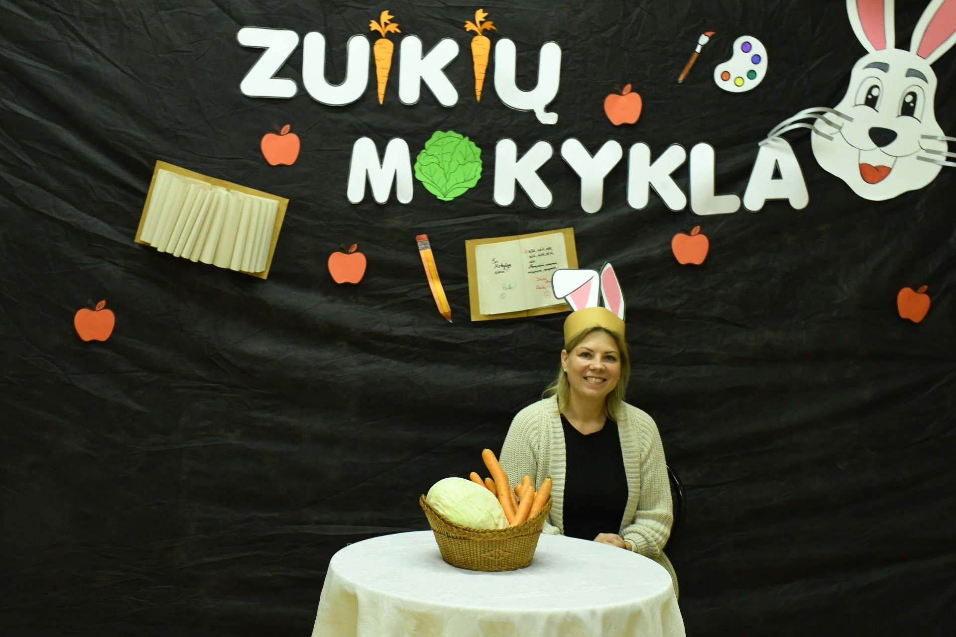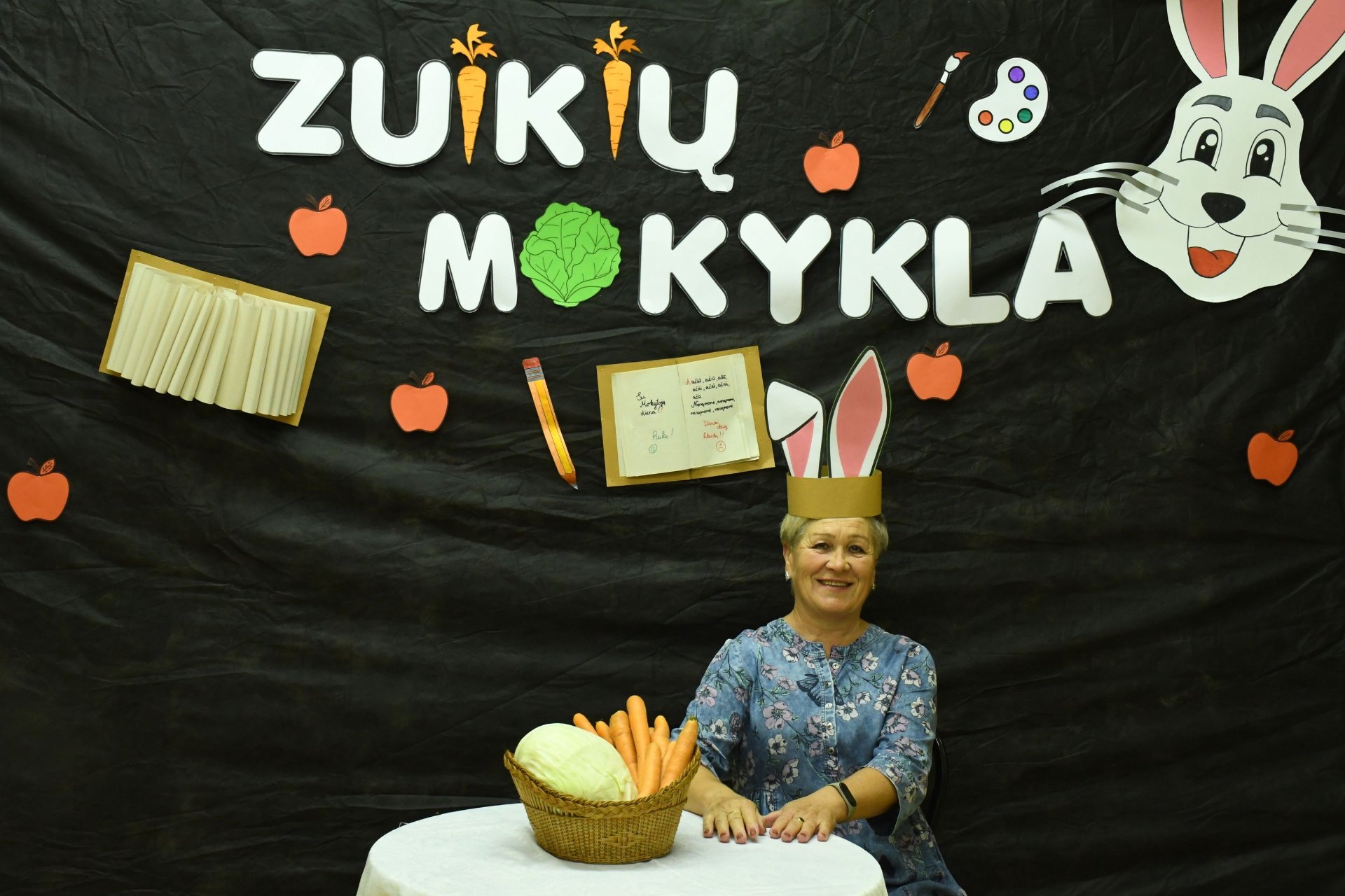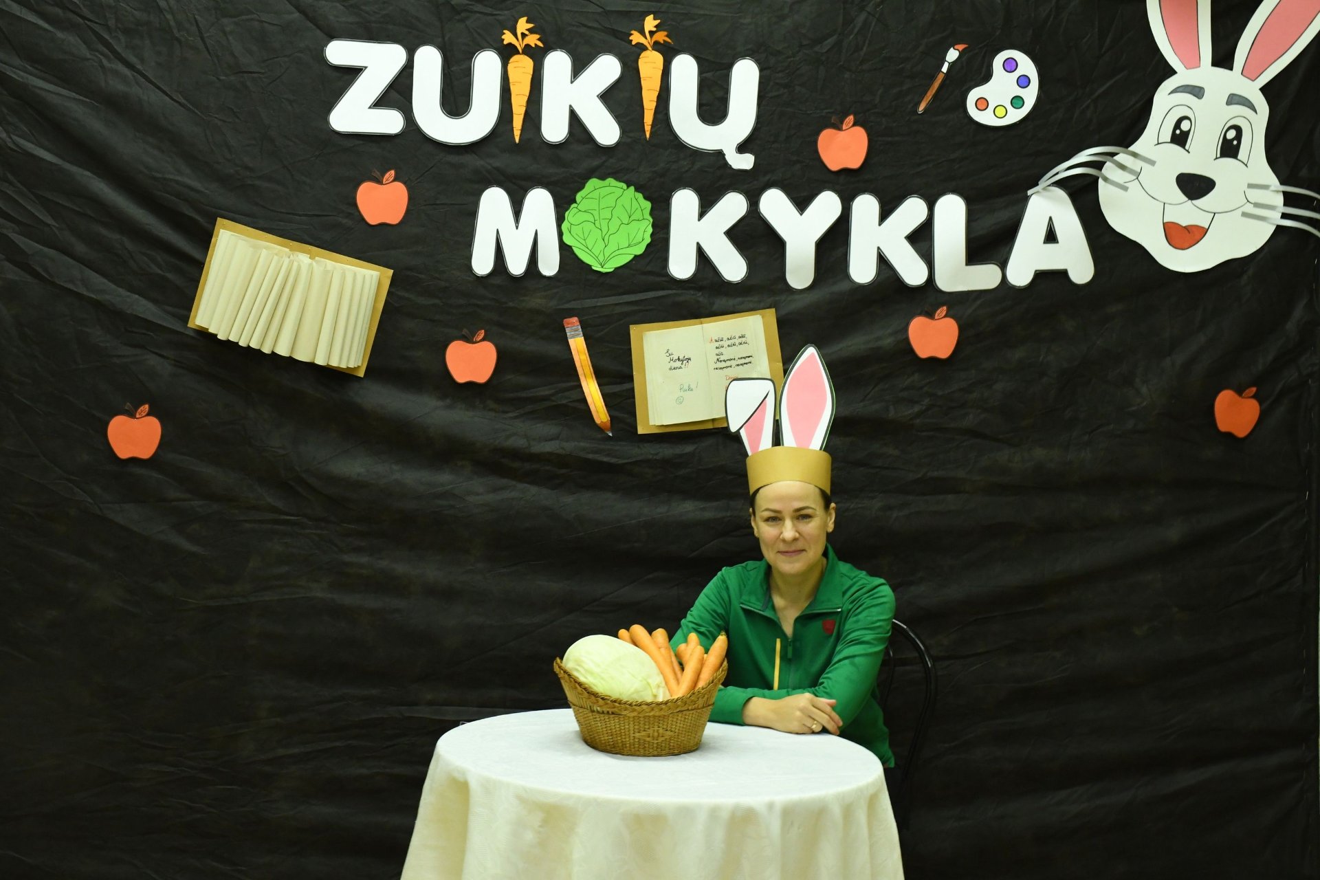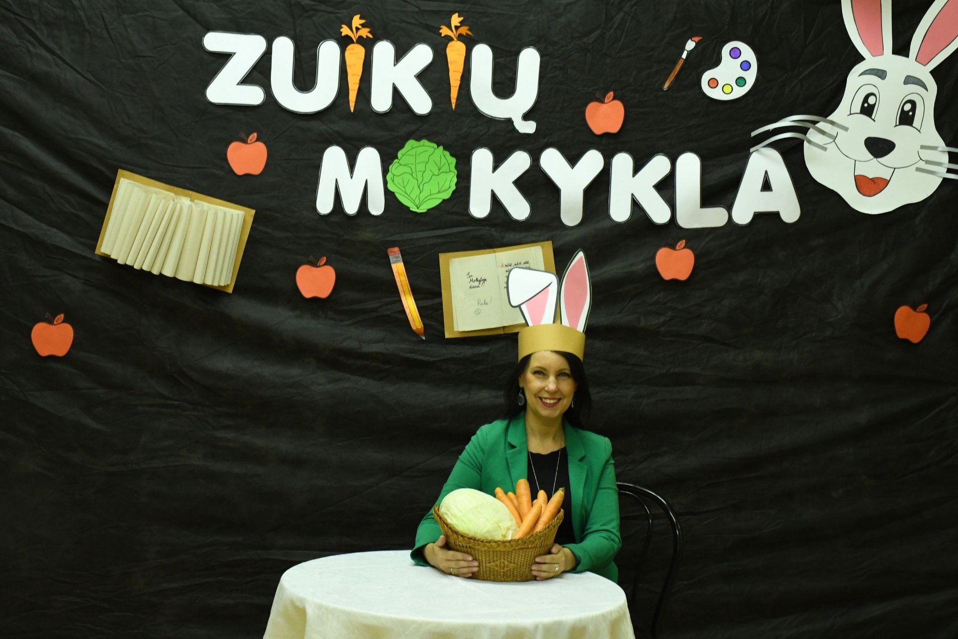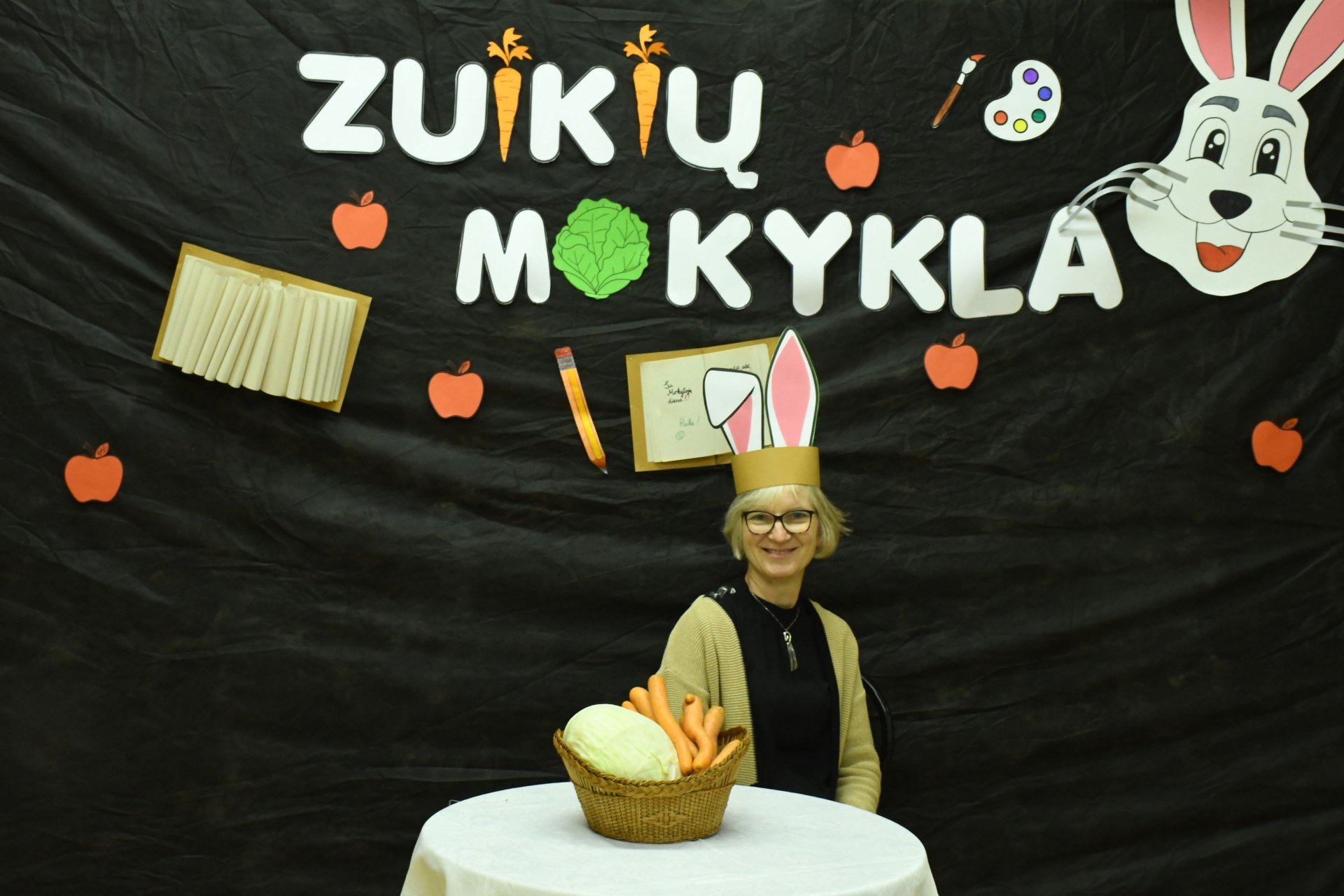 Po trijų pamokų pedagogai rinkosi į aktų salę – „zuikių“ mokyklą. „Zuikienė“ vedė mokytojams keturias pamokas. Fizinio ugdymo mokytojai rideno kopūstus, matematikos - sprendė loginius uždavinius. Per technologijų pamoką užmerktomis akimis reikėjo nupieštam žmogučiui „įdėti“ širdį, o biologijos žinių prireikė norint pripūsti balionus – buvo atliktas praktinis darbas ,,Plaučių tūrio matavimas“. Už puikius pasiekimus „zuikių“ mokyklos direktorius apdovanojo ,,mokinius" morkomis. Muzikinį kūrinį pianinu atliko Kajus. Gimnazijos pirmokai mokytojams padovanojo per technologijų pamokas „išaugintas“ gėles.