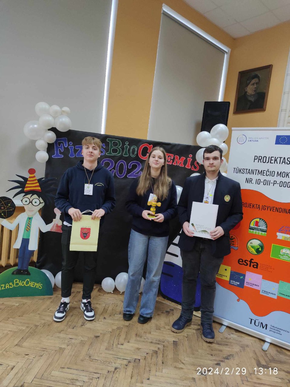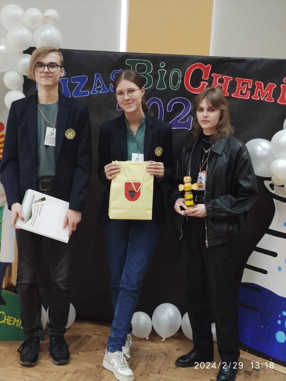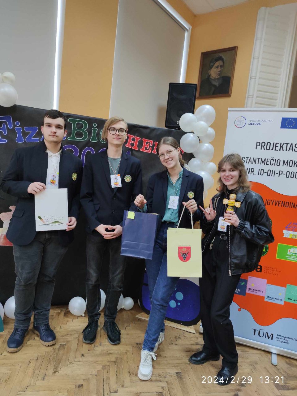 Šaltą vasario 29-osios rytą gamtos mokslais besidomintys Pakruojo „Atžalyno“ gimnazijos mokiniai kartu su fizikos mokytoja Vida Imanavičiūte ir Pakruojo „Žemynos“ progimnazijos mokiniais išvyko į 10-ąjį respublikinį konkursą „FizasBioChemis“, organizuojamą Joniškėlio Gabrielės Petkevičaitės-Bitės gimnazijoje. Proto miklumą išbandyti buvo smalsu ne tik mums, bet ir mokiniams iš Pasvalio, Joniškio, Biržų, Kupiškio ir net Skuodo mokyklų. Mūsų gimnazijai atstovavo dvi I-II ir III-IV klasių mokinių komandos. Renginį pradžioje buvę gimnazistai pasidalijo prisiminimais apie iniciatyvą organizuoti konkursą, džiaugėsi, kad tęsiamos tradicijos siekiant kilnaus tikslo – suburti visus mokinius, besidominčius gamtos mokslais, ir plečiamas jų akiratis. Konkurso organizatorė Rita Karpavičienė pasveikino visus susirinkusius, pasidžiaugė jubiliejine švente ir padėkojo prie renginio organizavimo prisidėjusioms mokytojoms bei mokiniams. Netrukus komandos jau skubėjo į atskirus kabinetus, kuriuose jų laukė fizikos, biologijos ir chemijos užduočių lapai. Kiekvieno dalyko užduotims atlikti buvo skirtas pusvalandis. Baigę spręsti uždavinius mokiniai buvo pakviesti į kūrybines dirbtuves, kuriose jiems reikėjo sukurti sveikinimą renginio 10-ojo gimtadienio proga. Vieni rašė eiles, kiti kūrė atvirukus, o dar kiti – dainas. Laukdami rezultatų mokiniai stebėjo sveikinimų pristatymus, kurie anaiptol nepaliko abejingų – jaunimas šypsojosi, salėje aidėjo juokas, o plojimai užpildė kiekvieną salės kampelį. Suskaičiavus taškus buvo apdovanotos abi mūsų gimnazijos komandos! 9-10 klasių grupėje Pakruojo „Atžalyno“ gimnazijos mokinių komanda iškovojo 1-ąją vietą, o 11-12 klasių – 2-ąją! Grįžome įgavę naujos patirties, sužinoję naujų dalykų ir, žinoma, pasikrovę geros energijos!