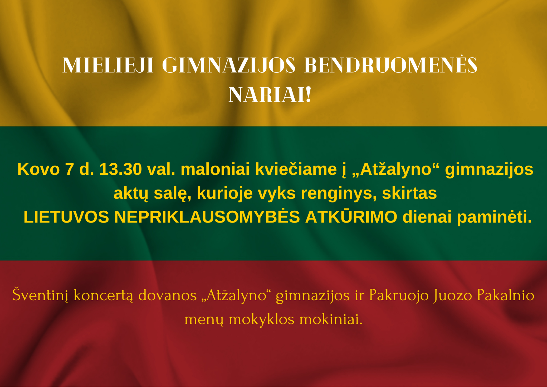 Kovo 10 d. 13 val. III virtualus respublikinis muzikos festivalis „DAINUOJU LIETUVAI 2024“, skirtas Lietuvos valstybės atkūrimo ir Lietuvos nepriklausomybės atkūrimo dienai. Džiaugiamės ir didžiuojamės, kad jame pasirodys ir mūsų gimnazijos ukulėlių ansamblis „Fireflies“– išgirsime jų atliekamą dainą „Žemė mano“ (m. ir ž. Rasos Stoškuvienės) Už šią galimybę nuoširdžiai dėkojame mokyklos direktorei Astai Valuntienei. Ukulėlių ansamblio „Fireflies“ pasirodymo eilės Nr. 76. Kviečiame kovo 10 dieną visą gimnazijos bendruomenę pasiklausyti dainų, skirtų mūsų mylimai Lietuvos žemei.
