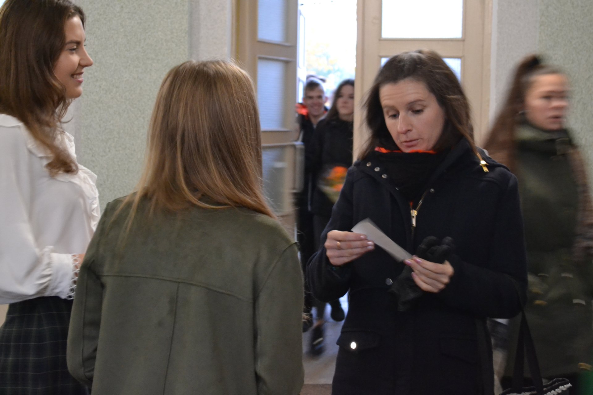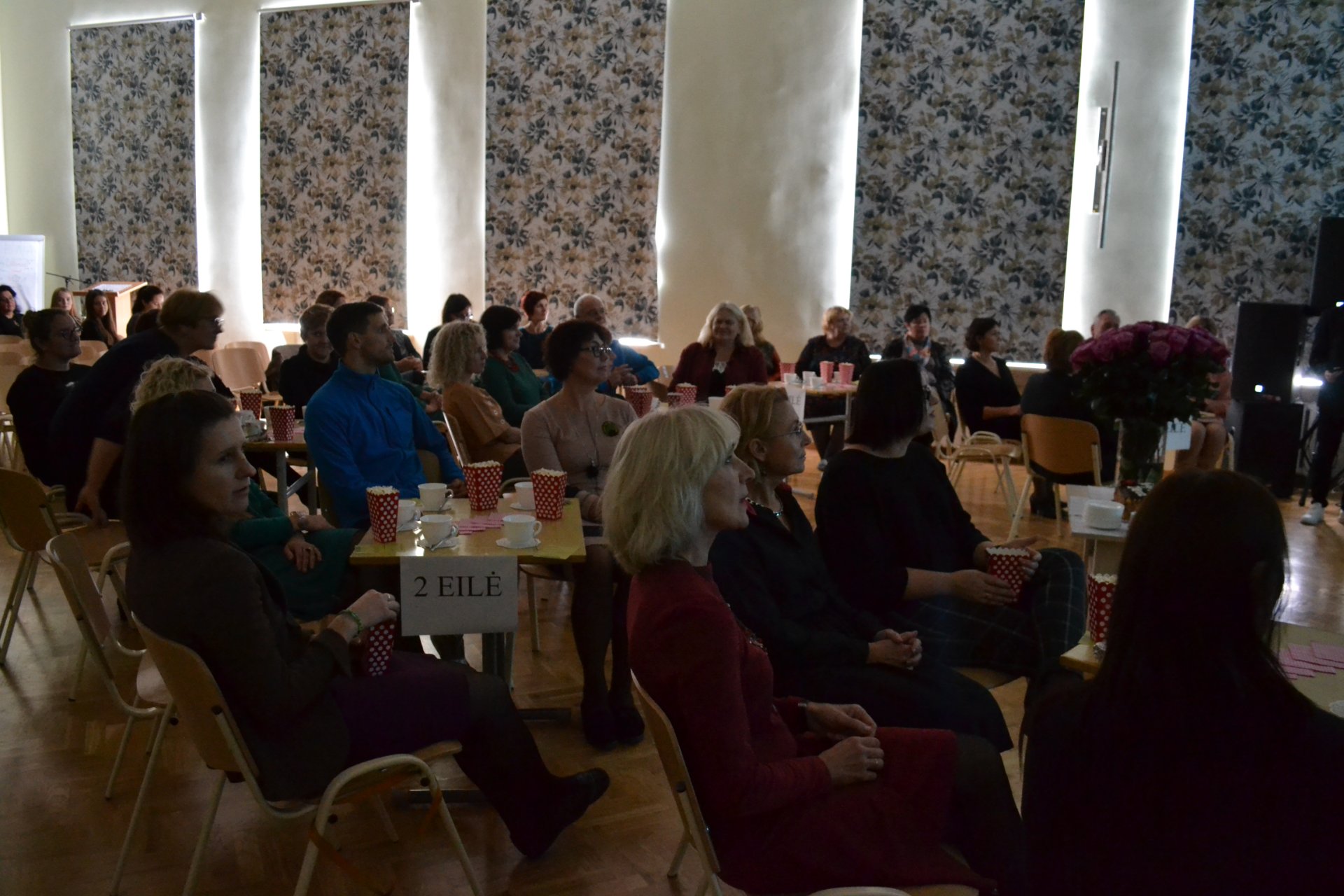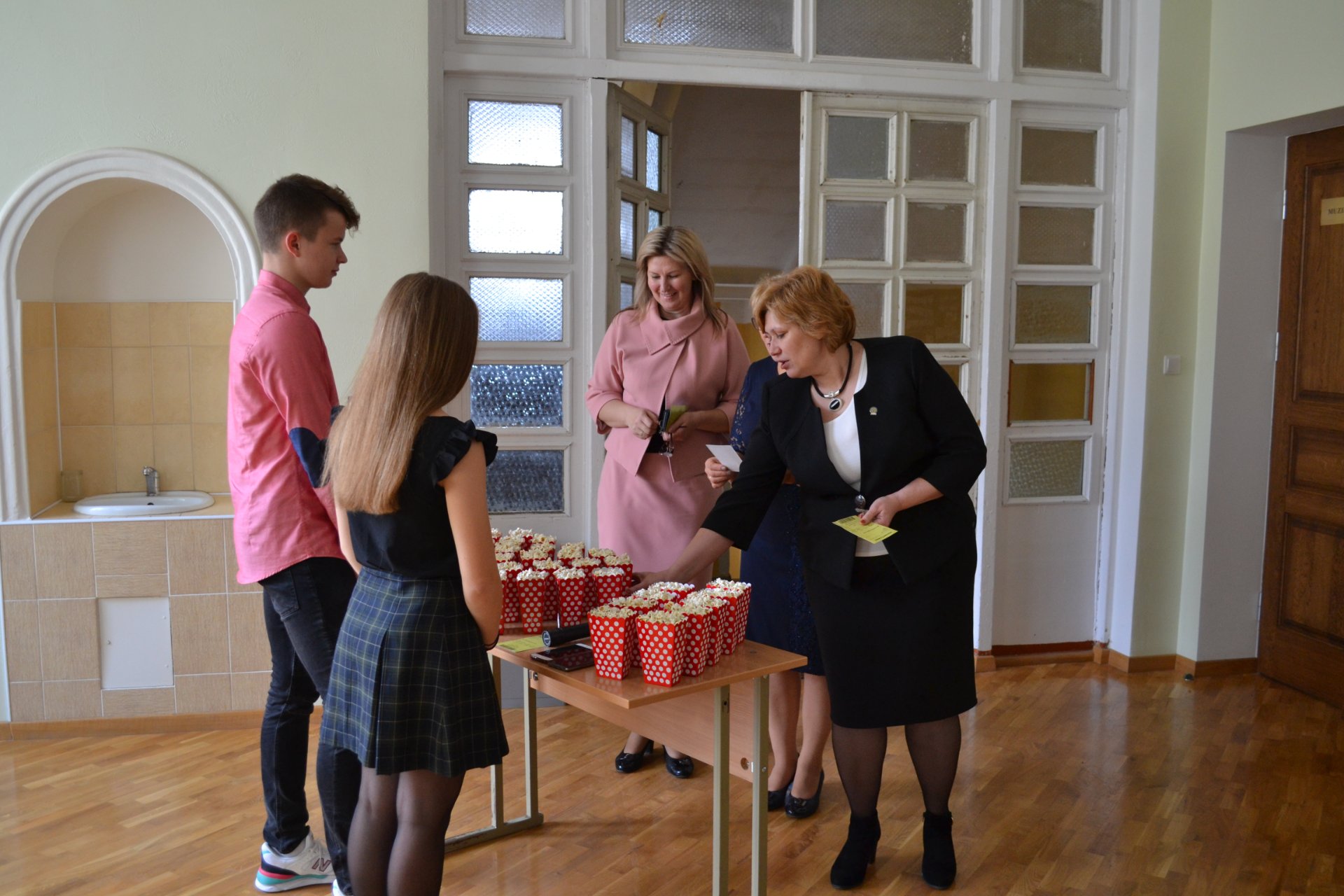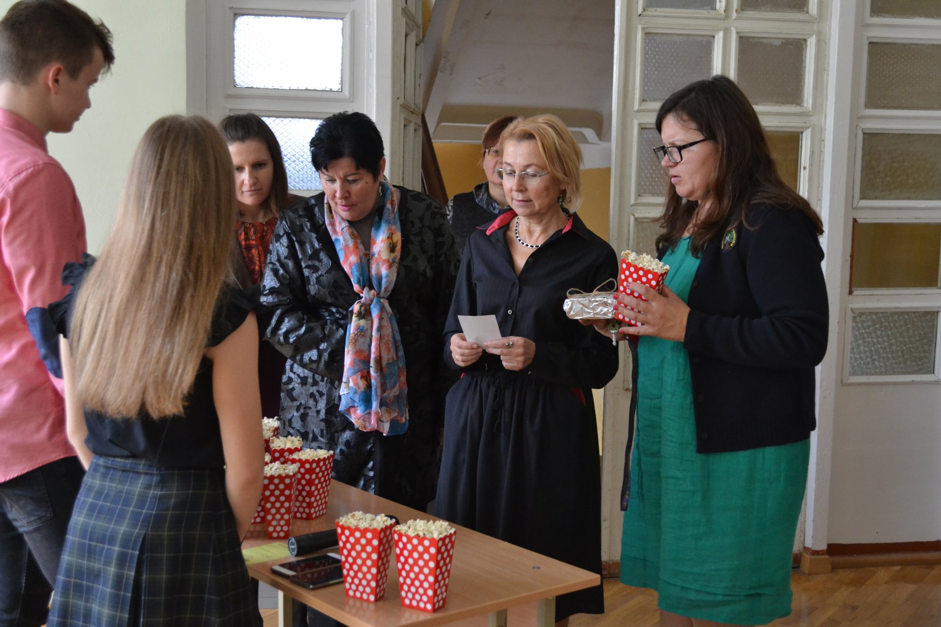 Po 4 pamokų visi pedagogai skubėjo į posėdžių ir konferencijų salę. Išsirinkę mėgstamų kukurūzų spragėsių, jie buvo maloniai palydėti prie biliete nurodytos vietos. Filmą kūrė, galima sakyti, visi gimnazistai, nes vieni dėkojo mokytojams, kiti deklamavo eilėraščius, treti rado įvairių minčių, kurių pirmosios raidės atitiko žodžio MOKYTOJAS raides, buvo ir tokių, kurie dainavo, vaidino. Originalūs vaikų pasveikinimai pedagogus nudžiugino, galbūt net ir nustebino. Po kino filmo peržiūros merginų ansamblis visiems dovanojo skambią dainą. Sveikinimo žodžius tarė abiturientai Dinas ir Titas Majauskai, mokytojų rankose pražydo kvapnūs rožių žiedai, kuriuos įteikė kiti ketvirtokai vaikinai. Vėliau ugdytojai galėjo prie kavos ir arbatos pasišnekučiuoti bei pasivaišinti tortu. Labai tikimės, kad mokytojai džiaugsmingai prisimins šią dieną, į atmintį įsirėš išgyventos emocijos...