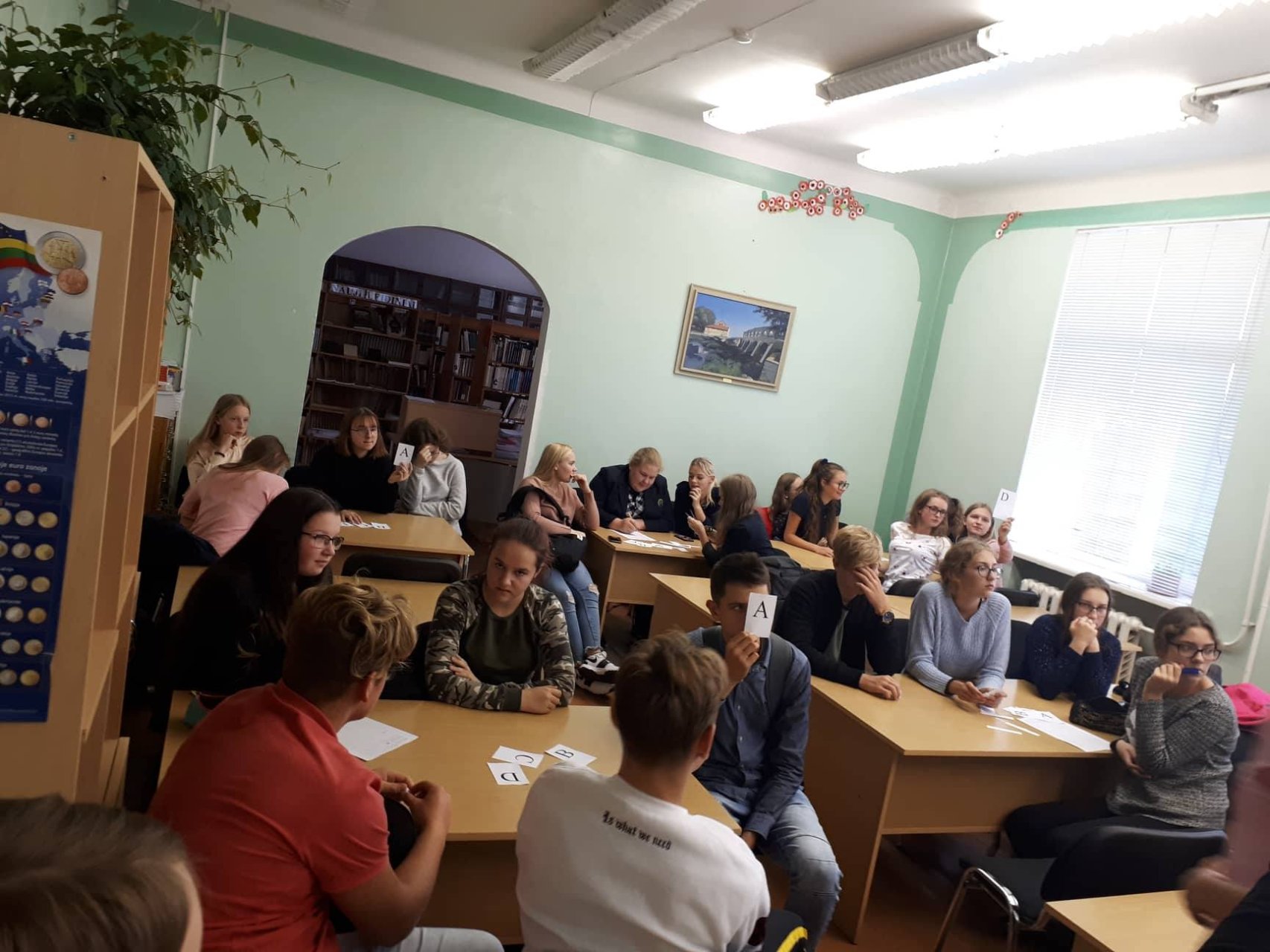 Rugsėjo 24-osios popietę mūsų gimnazijos bibliotekoje vyko geografijos viktorina, kurioje dalyvavo pirmokų, antrokų ir trečiokų mokinių komandos. Šešios gimnazistų grupės buvo labai aktyvios: ekrane pasirodžius teisingam atsakymui pakeldavo vieną iš keturių kortelių. Visą procesą stebėjo komisijos nariai ir džiaugėsi tolerantiškai bendradarbiaujančiais mokiniais. Pabaigoje buvo apžvelgti atsakymai ir pasidžiaugta šauniais rezultatais.