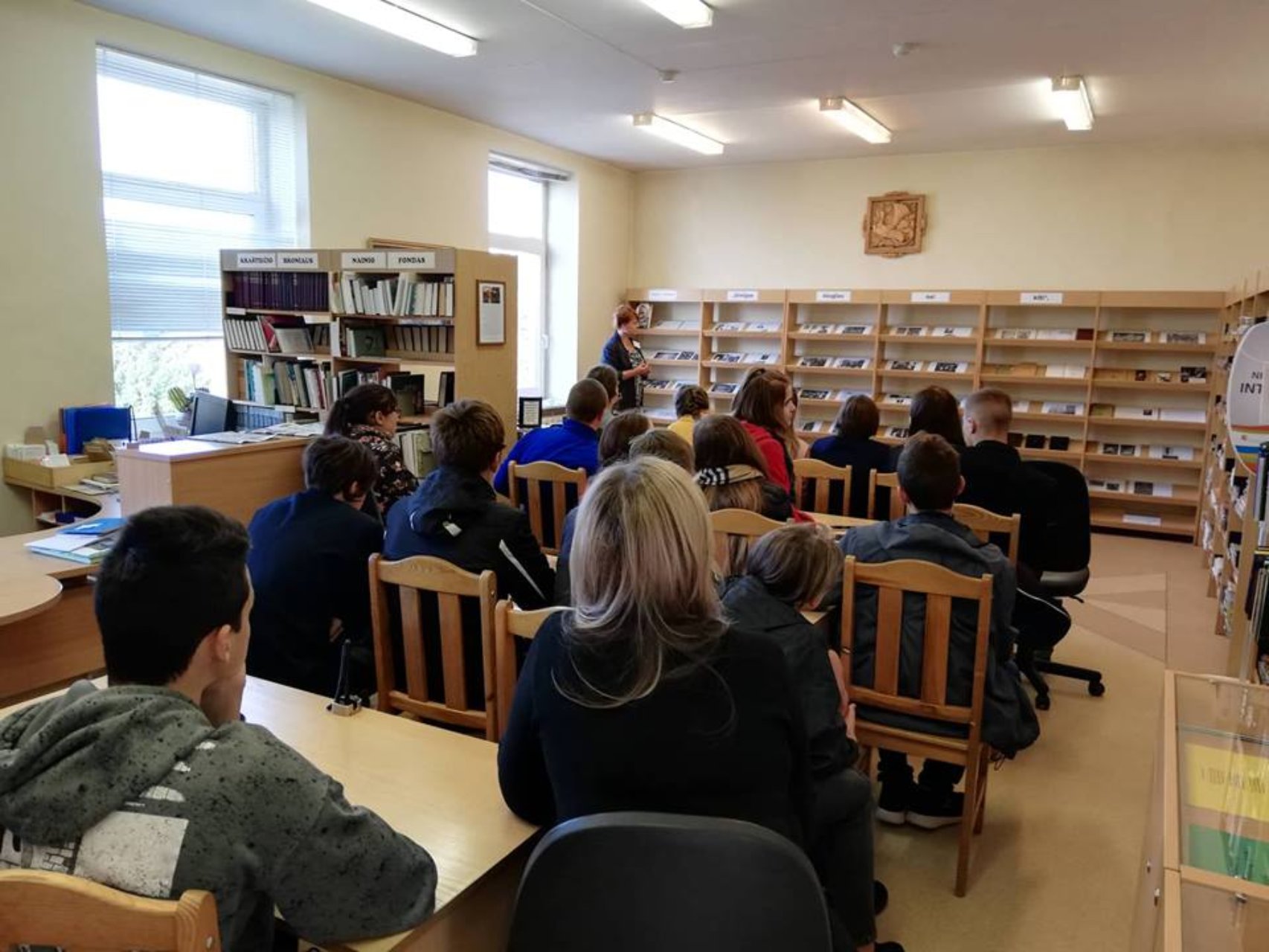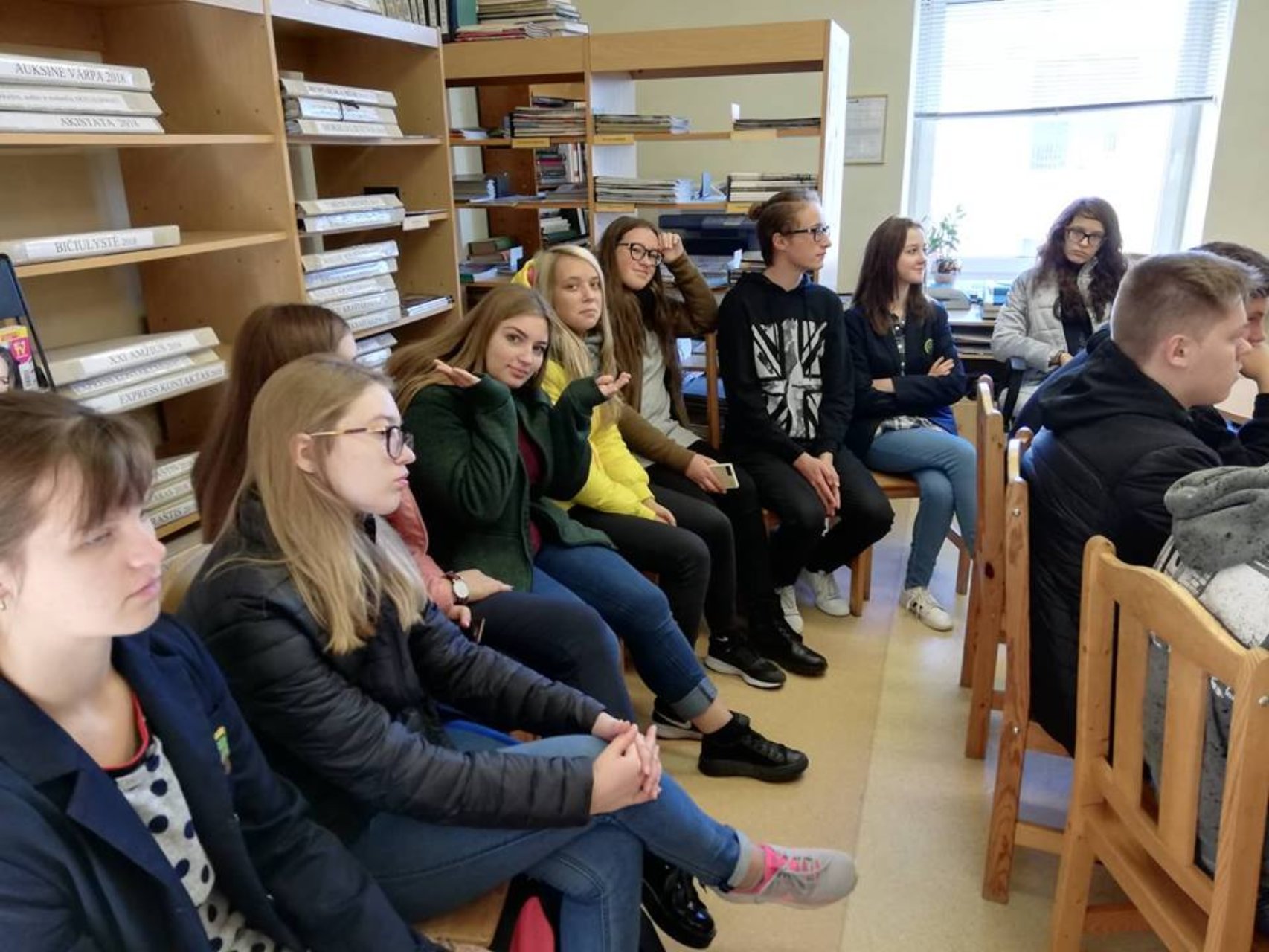 Ta proga rugsėjo 25 dieną Ic klasės gimnazistai ir lietuvių kalbos mokytoja Romualda Juknevičienė šiugždendami auksinio rudens paklotus lapus po kojomis keliavo į Pakruojo rajono savivaldybės Juozo Paukštelio viešosios bibliotekos skaityklą. Mus šiltai pasitiko skaitytojų aptarnavimo skyriaus vedėja Judita Jereckienė, kuri papasakojo apie parengtą dokumentų parodą „Įžvelgęs daugiau nei kiti“, skirtą Vydūnui. Buvo įdomu išgirsti nežinomų faktų apie rašytojo asmenybę, gyvenimą ir veiklą, pasklaidyti jo kūrinių puslapius. Nuoširdžiai dėkojame bibliotekininkei už papildytą žinių kraitelę, malonų priėmimą ir galimybę pabūti jaukioje aplinkoje.