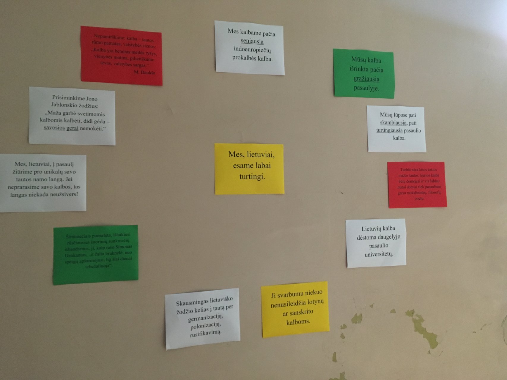 Lietuvių kalbos ir literatūros mokytoja Gražina Spudienė kartu su mokiniais ieškojo prasmingų minčių apie gimtąją kalbą. Stende puikavosi įvairūs posakiai apie lietuvių kalbos grožį, svarbą šiuolaikiniame gyvenime, ypač aktualūs pasirodė Jono Jablonskio žodžiai: „Maža garbė svetimomis kalbomis kalbėti, didi gėda – savosios gerai nemokėti.“ Pirmokai gimnazistai užsienio kalbomis parengė lankstinukus, plakatus apie įvairių šalių istorines asmenybes, garsius atlikėjus, rašytojus, menininkus. Buvo gera proga susipažinti su Anglijos, Rusijos istorija, žymių žmonių biografijomis. Tokia diena – kvietimas domėtis įvairiomis Europos, regionų ir tautinių mažumų kalboms.