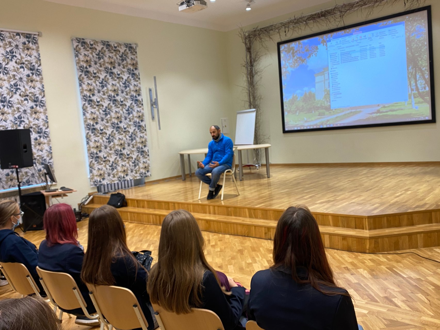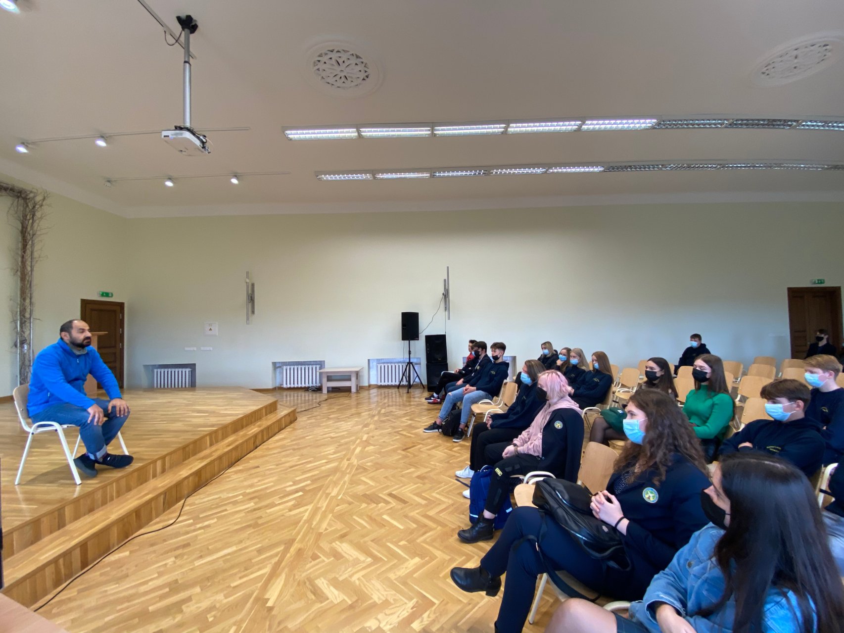 Spalio 1 dieną mūsų gimnazijoje viešėjo kino režisierius Maratas Sargsyanas, kuris pristatė kino buso projekto du filmus. Gimnazijos pirmokai žiūrėjo prancūzų režisieriaus Ameris biografinę juostą „Mari gyvenimas“, o II-III klasių gimnazistai - Giedrės Žickytės filmą „Kaip mes žaidėme revoliuciją“.