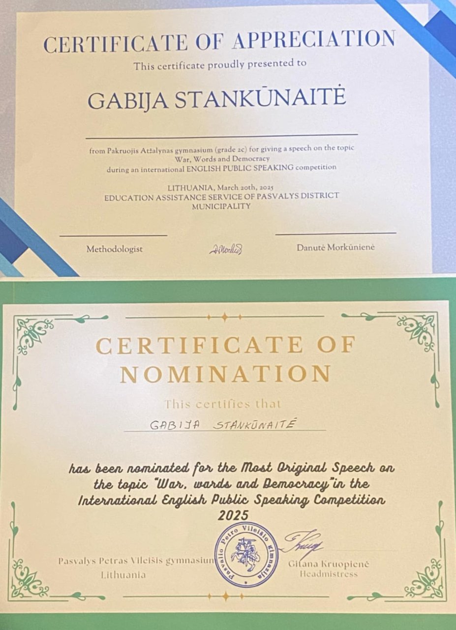 Šių metų kovo 20 dieną kartu su anglų kalbos mokytoja Vilma Sabaliauskiene išvykome į Pasvalį. Ten vyko tarptautinis oratorių konkursas anglų kalba, kalbėjimo tema „War, Words and Democracy“ („Karas, žodžiai ir demokratija“). Mokiniai turėjo parašyti savo kalbą, išmokti ją atmintinai ir įtaigiai ją pasakyti salei, pilnai žiūrovų. Po kalbos konkurso dalyviai atsakinėjo į klausytojų pateiktus klausimus duota tema. Dalyvius vertino tarptautinė anglų kalbos mokytojų komisija.