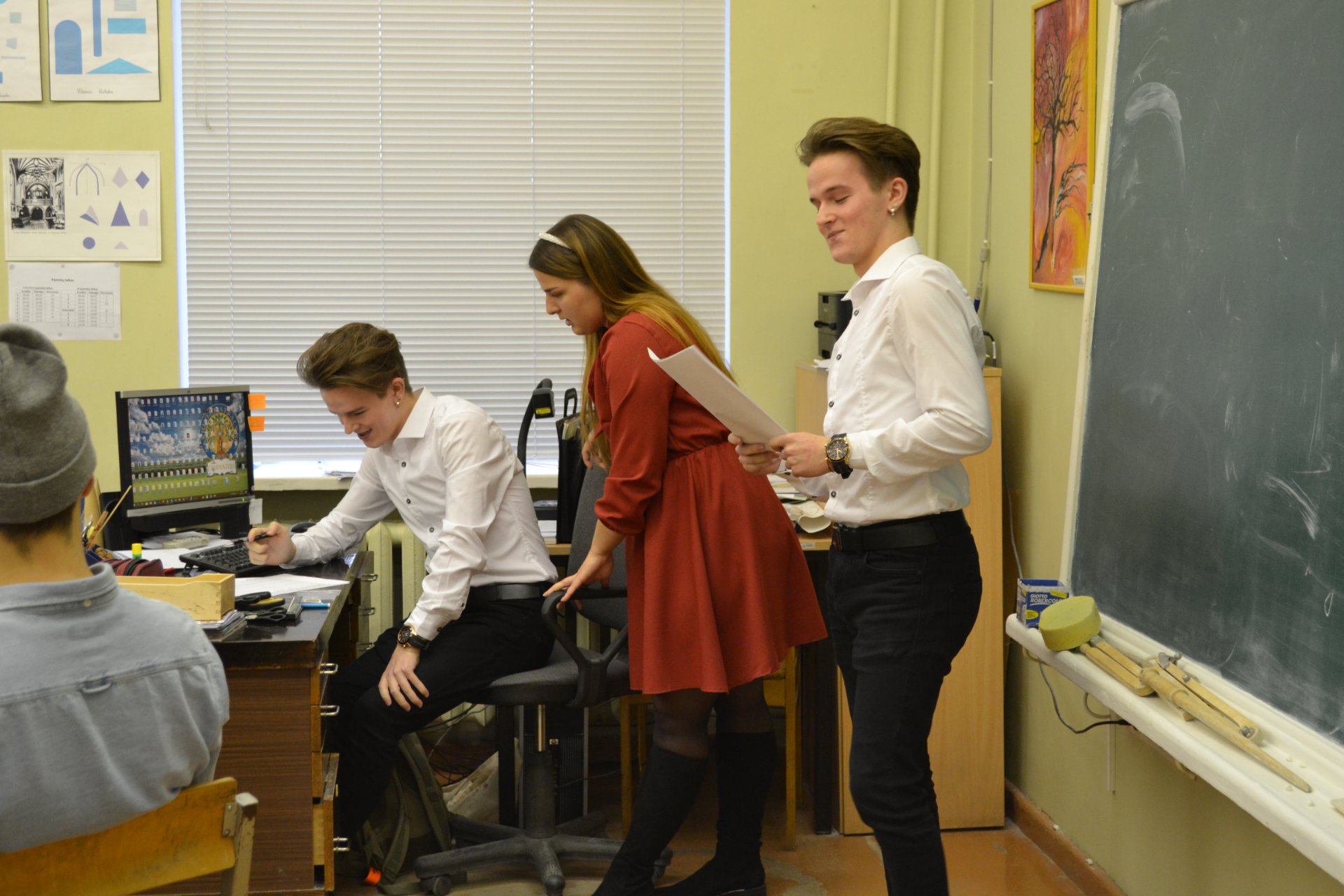 Lapkričio 22 dieną gimnazijoje vyko savivaldos diena – abiturientai tapo mokytojais bei kitais gimnazijos darbuotojais. Rimtai pasiruošę pamokoms, jie išskubėjo mokyti jaunesniųjų mokinių.
