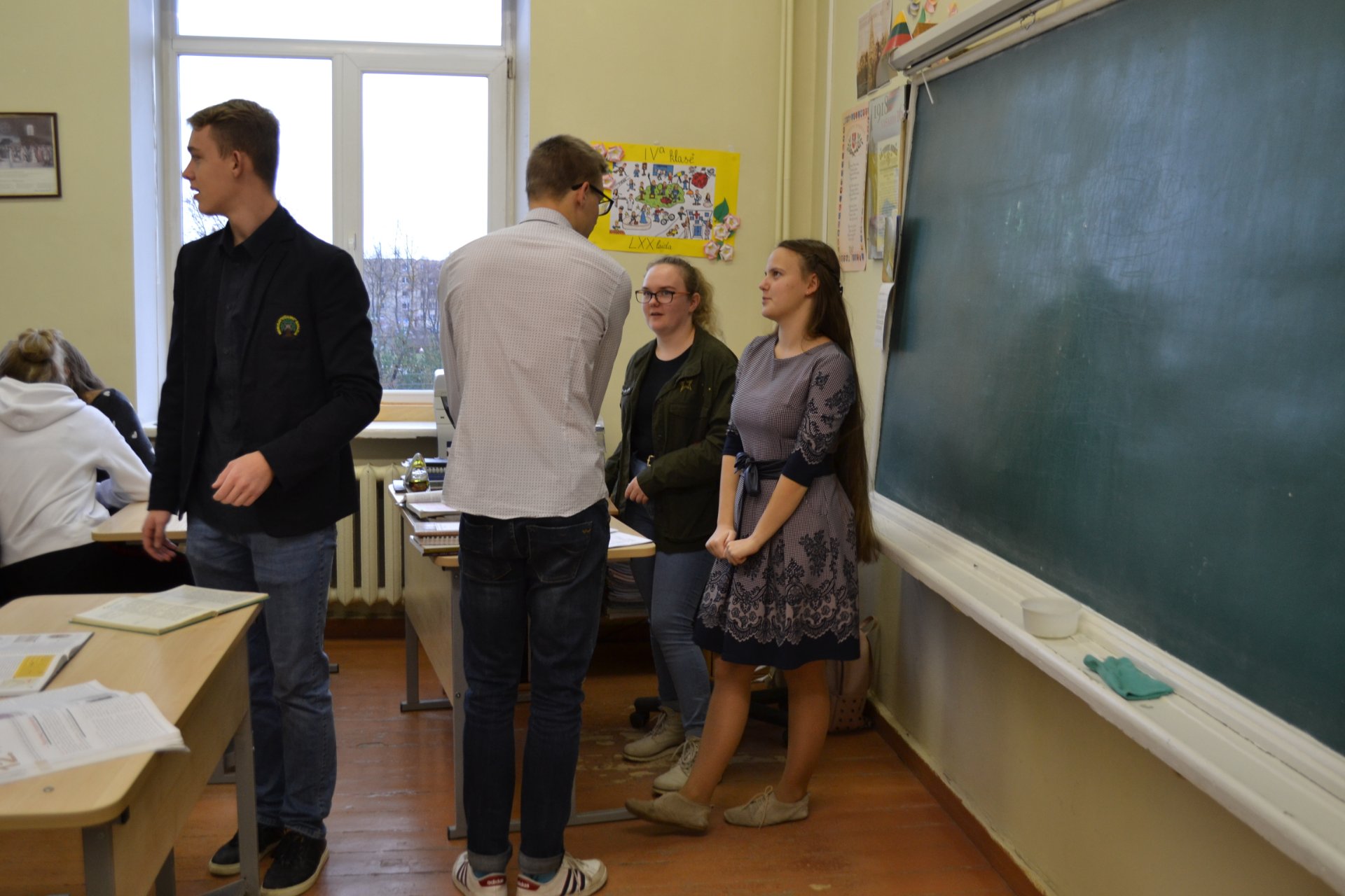 Per trečią pamoką vyko įdomi veikla tikriesiems mokytojams, užsiėmimą vedė ketvirtokai Titas ir Dinas Majauskai bei Gabija Jareckaitė. Pedagogai aptarė atliktus namų darbus, taip pat komandose atliko kūrybinę užduotį – iš laikraščių ir žurnalų iškarpų ruošė kitas grupes apibūdinančius plakatus ir juos pristatė. Visų mokytojų darbas buvo įvertintas puikiai.