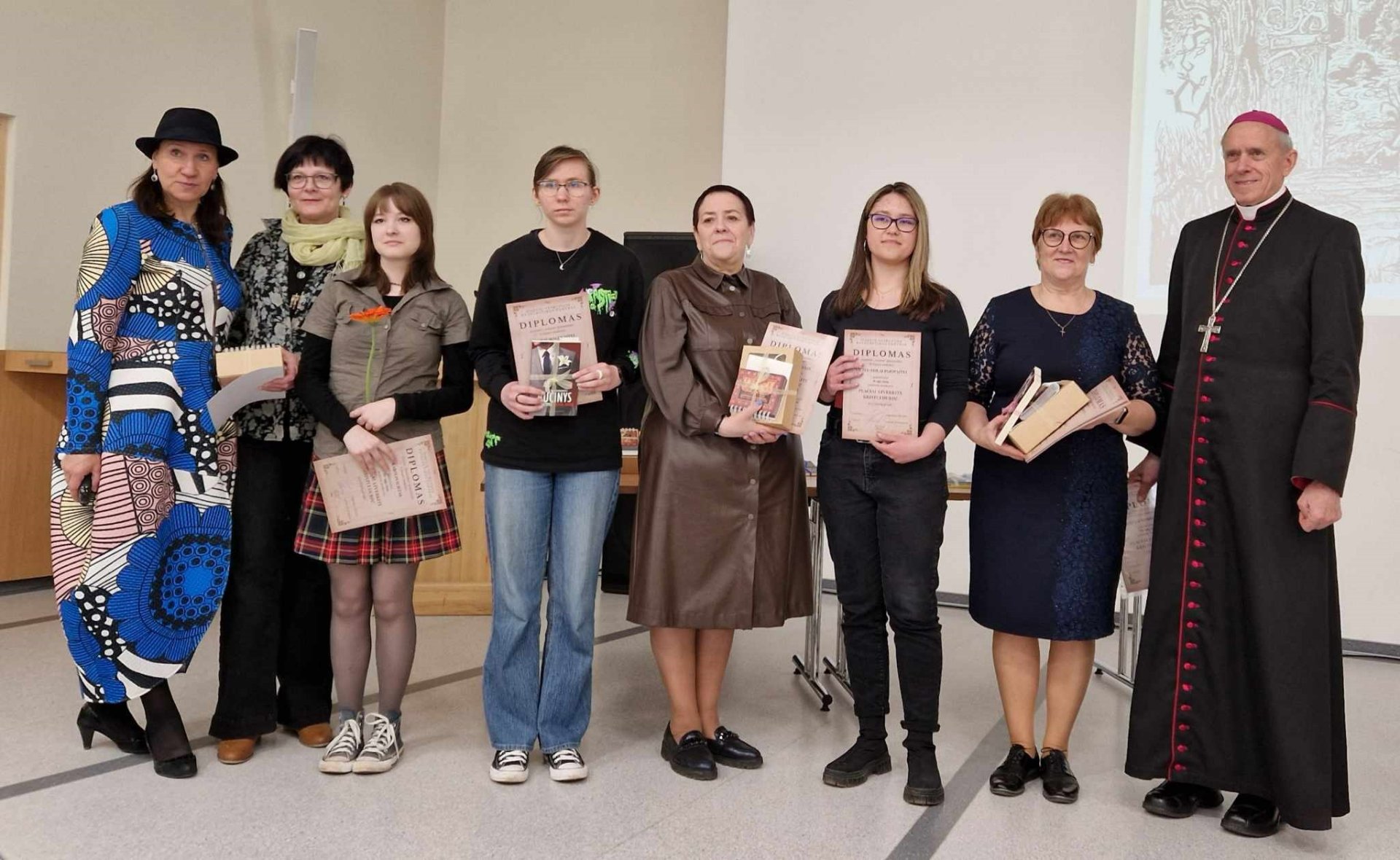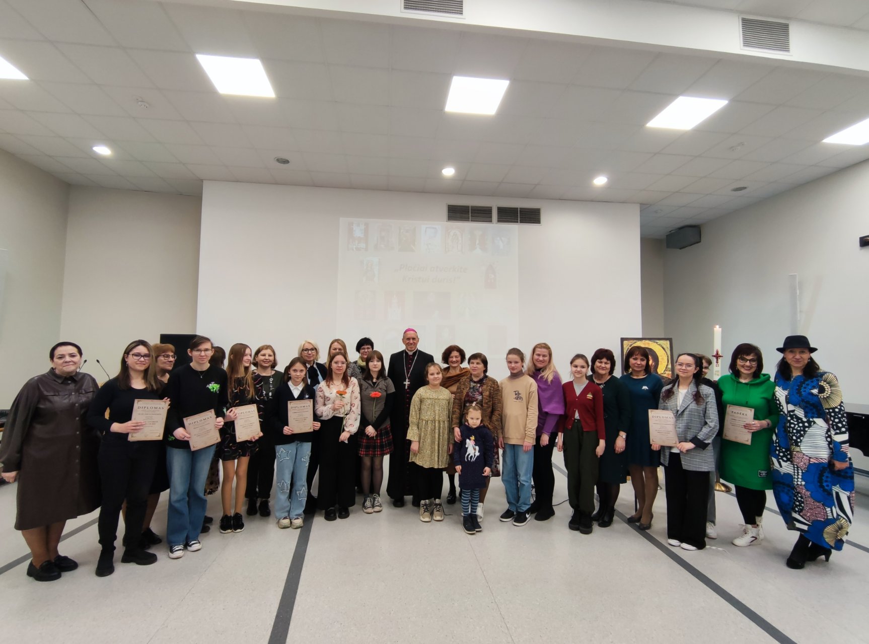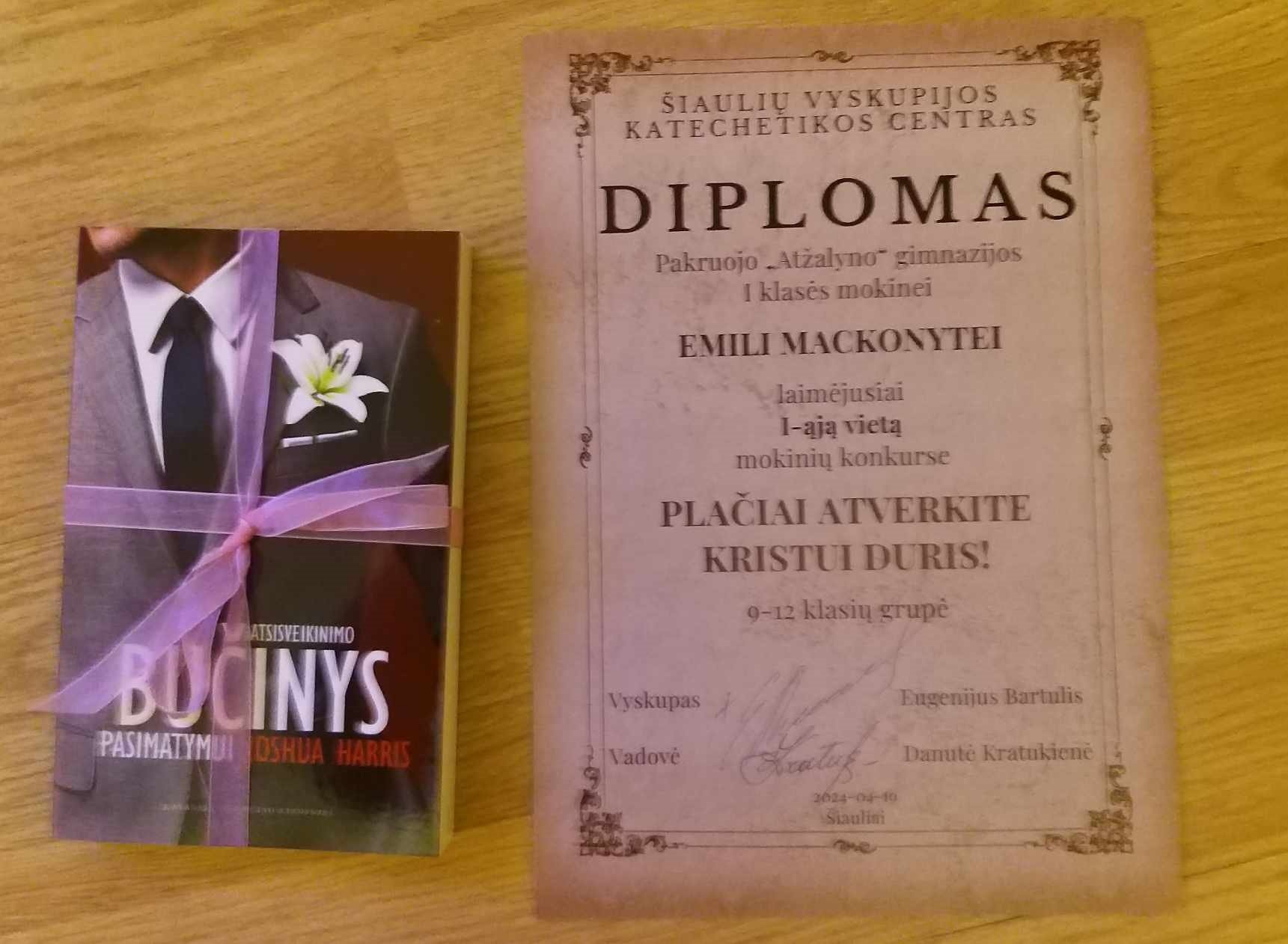 Balandžio 19 d. Šiaulių vyskupijos Katechetikos centre vyko mokinių konkurso „Plačiai atverkime Kristui duris!“ laureatų apdovanojimo renginys. Konkurse dalyvavo 39 mokymo įstaigos. Buvo pristatyti 125 darbai, iš kurių 20 geriausiųjų yra eksponuojami Šiaulių vyskupijos Pastoraciniame centre. Mokiniams konkursui ruoštis padėjo 44 mokytojai. Mūsų gimnazijos I a klasės mokinė Emili Mackonytė I-IV gimnazijos klasių grupėje užėmė I vietą. Visi laureatai buvo paskatinti atminimo dovanėlėmis. Džiaugiamės ir didžiuojamės Emili sėkme.