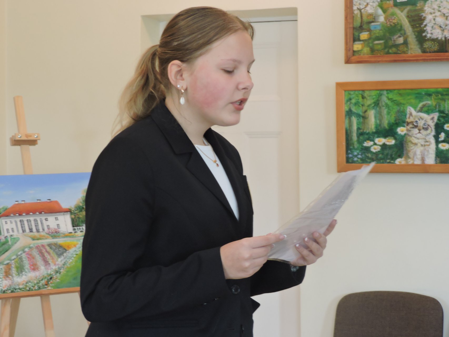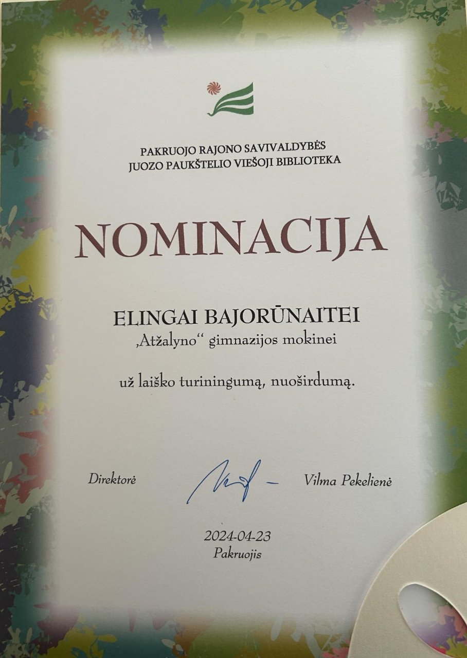 Padrąsinta lietuvių kalbos ir literatūros mokytojos Romualdos Juknevičienės į gimtąją kalbą nuoširdžiai kreipėsi ir mūsų I a klasės gimnazistė Elinga Bajorūnaitė. Mergina domisi grožine literatūra, puoselėja meninį žodį ir labai mėgsta kurti. Džiaugiamės mokinės dalyvavimu konkurse. Gimnazistei įteikta nominacija už laiško turiningumą ir nuoširdumą.